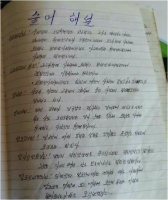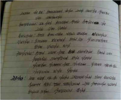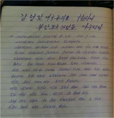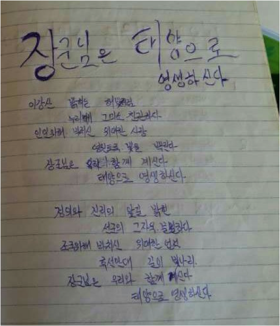 The luggage contained dozens of handwritten pages (only seventeen were photographed and passed on to HRNK), mostly containing poems and songs dedicated to the three Kims and the Kim regime as well as some of the fundamentals of North Korean ideology, including the “juche” doctrine of self-reliance. The sailor took detailed notes on the meaning of North Korea as a “strong and prosperous nation,” on the “songun” military-first policy, and on North Korea’s “gun barrel philosophy.” The notes, likely meant to be read and rehearsed while at sea, remind the North Korean sailor that “motherland is the bosom of Our General.” The sailor, most likely a Korean Workers’ Party member, thus enjoying relatively good “songbun” status in North Korea’s loyalty-based social classification system, reminds himself through the notes that monthly Party membership dues must be paid. The sailor, having written down the lyrics of songs dedicated to both “General Kim Il-sung” and “General Kim Jong-il,” includes vows to serve the General “for ten million years,” and to “defend General Kim Jong-un with our lives,” to the very end of space and time.